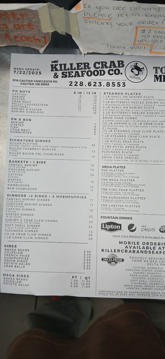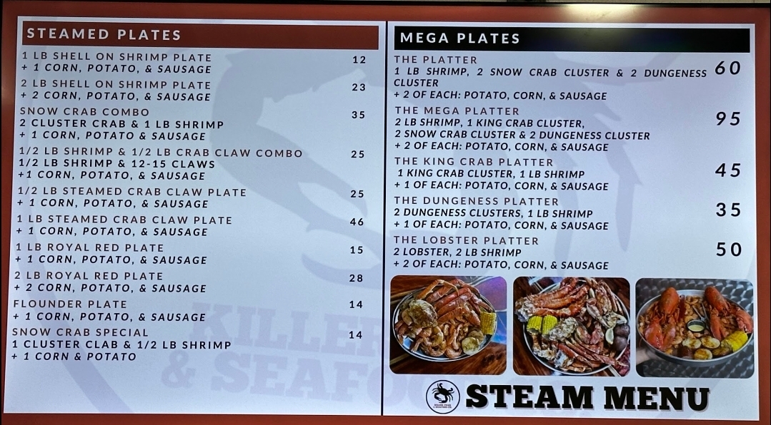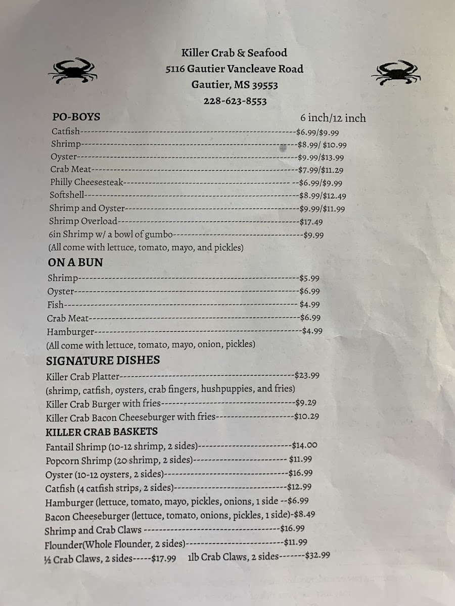 If you're craving a seafood feast, look no further than the Killer Crab & Seafood Menu. Located at 5116 Gautier Vancleave Rd, Gautier, MS, this place offers a mouthwatering selection of fresh crab and other seafood options that will leave you coming back for more. Whether you're in the mood for classic crab boils, buttery shrimp, or a decadent lobster tail, they've got something to satisfy every seafood lover. The menu also features a variety of flavorful sides, perfect for pairing with your main dish, from corn on the cob to seasoned potatoes. Each item is crafted with quality ingredients and cooked to perfection, making it a go-to spot for anyone craving that fresh-from-the-ocean taste. Don’t forget to check out their daily specials, which bring something new to the table every time.